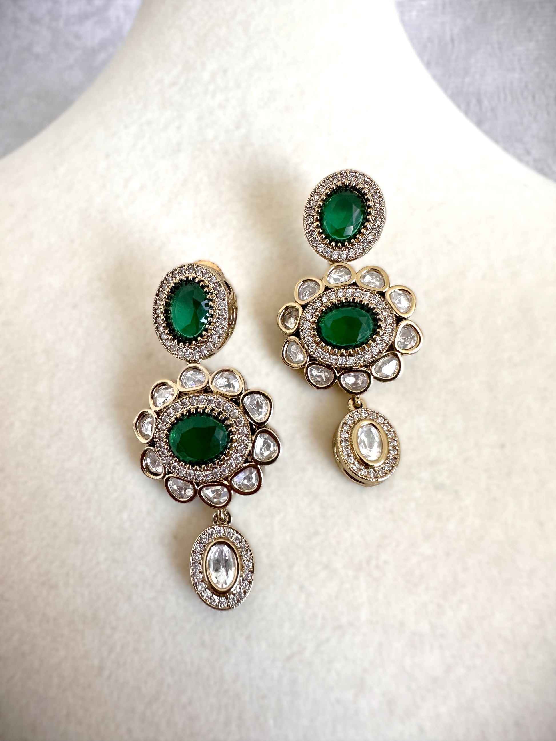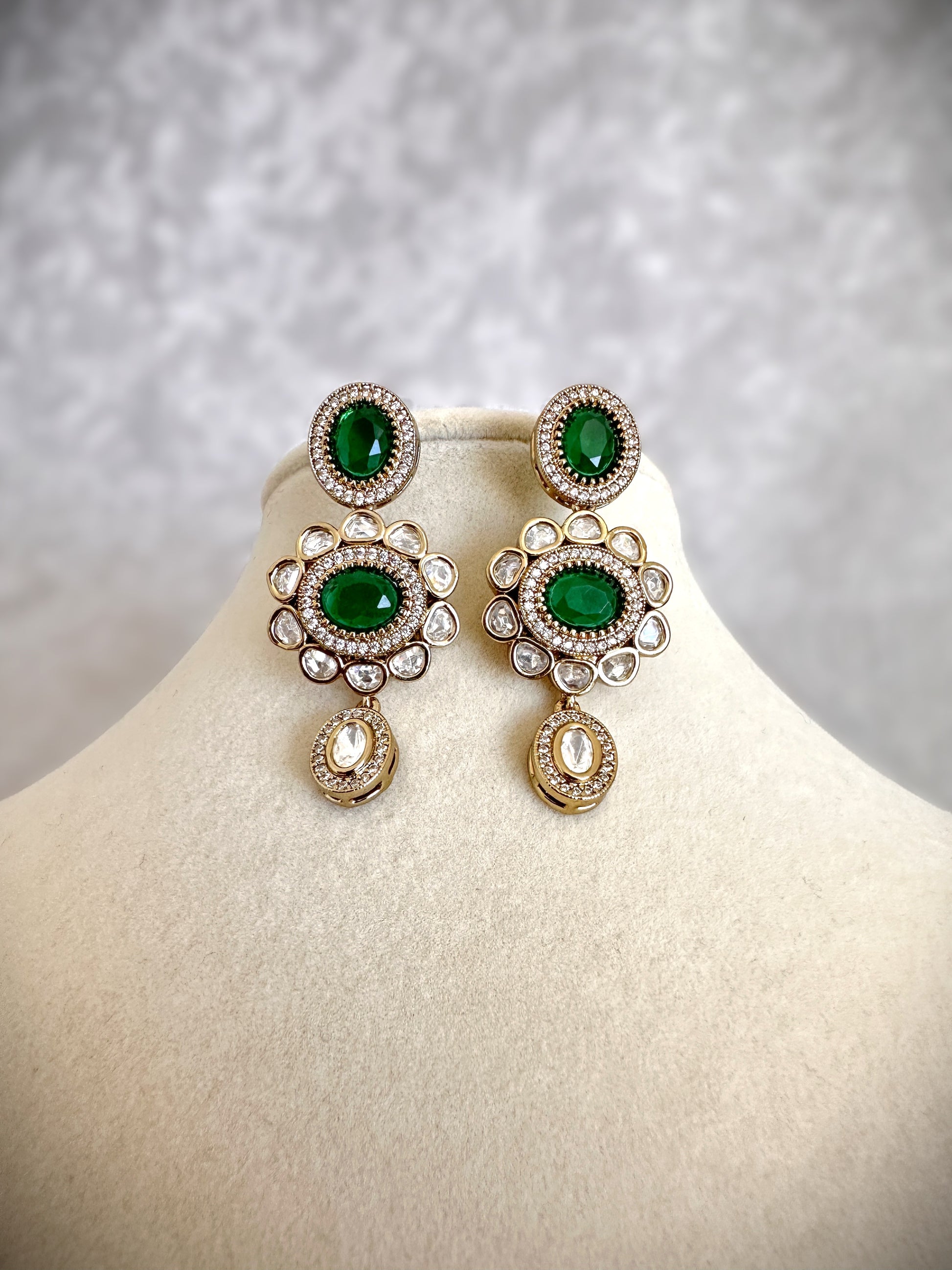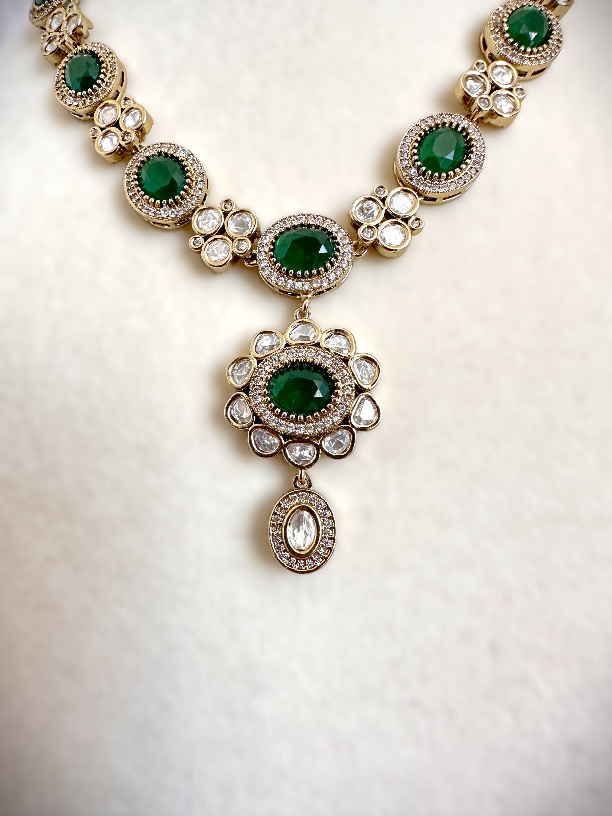 Long mala-style necklace featuring vibrant green gems, paired with matching green gem earrings.