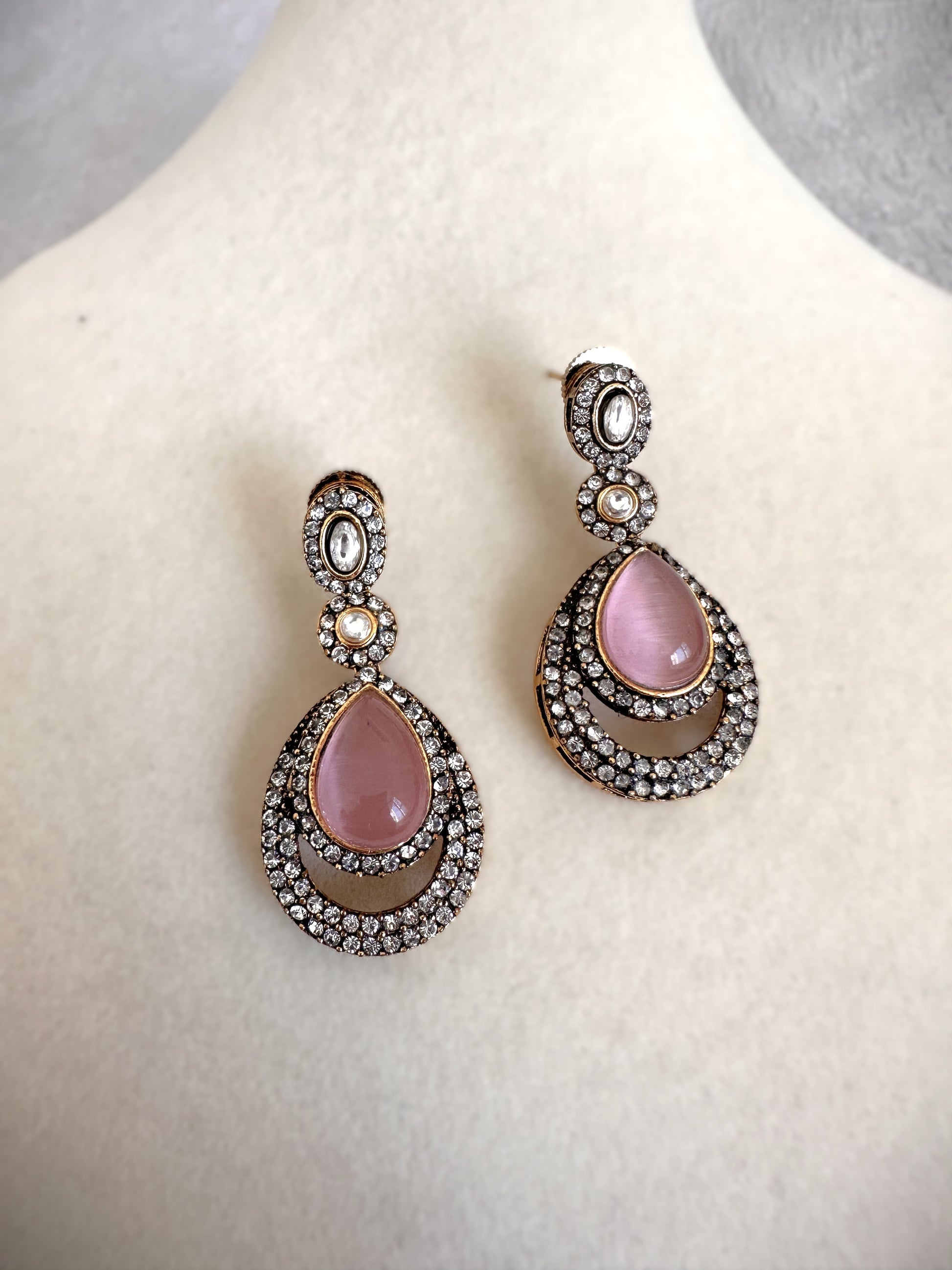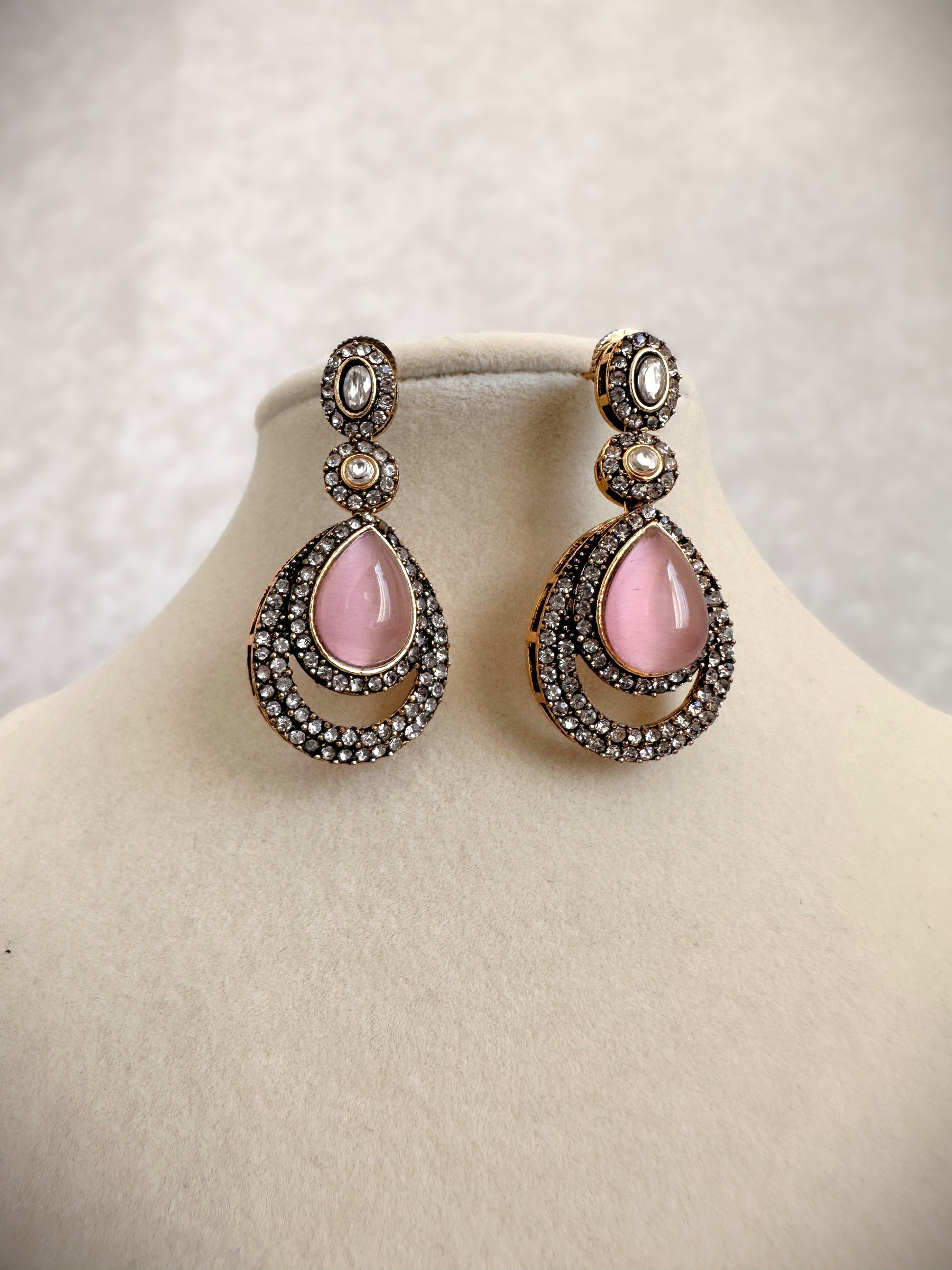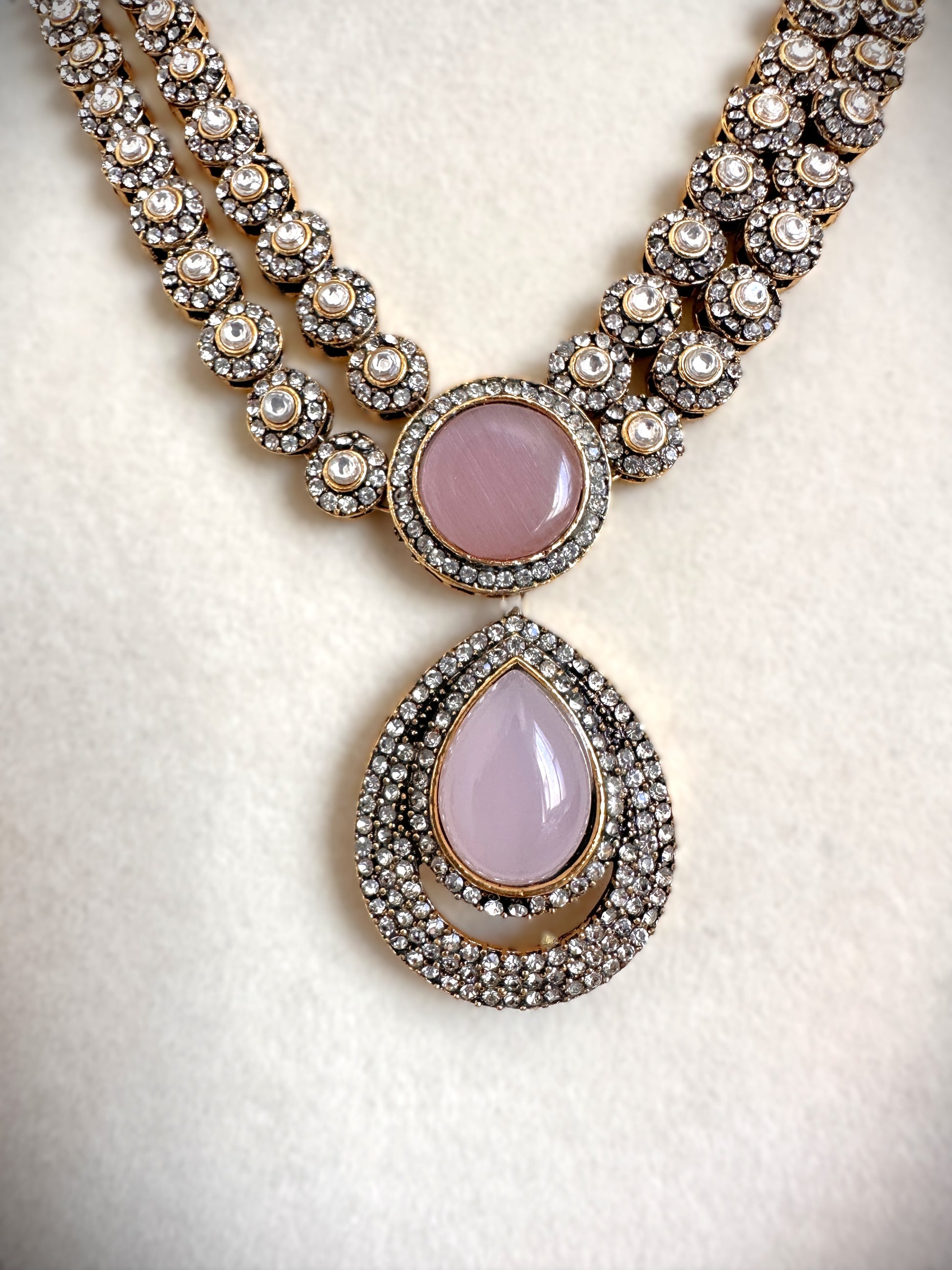 A graceful long mala necklace featuring a striking pink pendant that adds a soft pop of color.